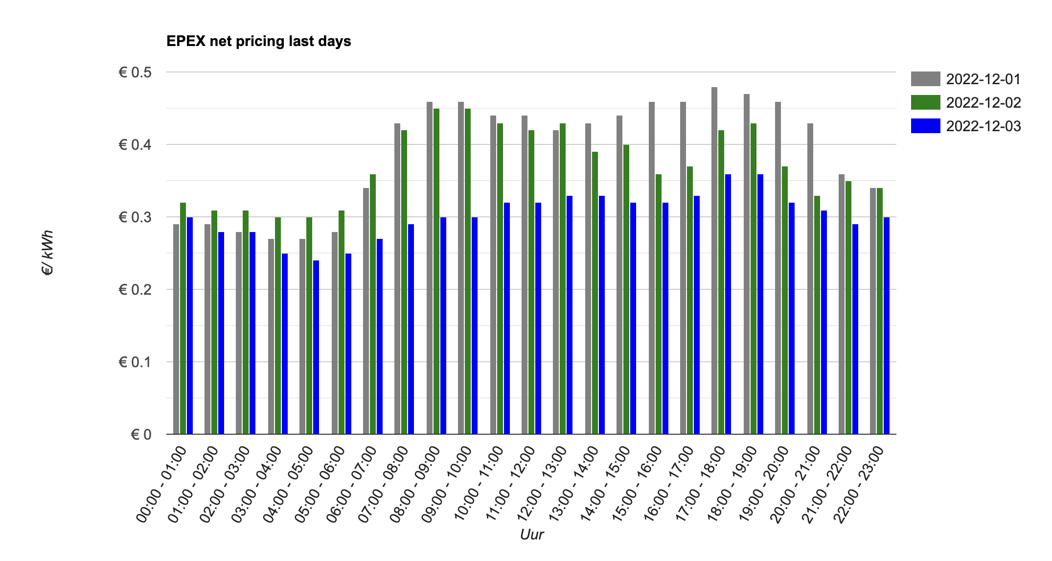 In the above example we see the peak price of December 2nd (green bar) between 8AM and 10AM, both of around 0.45€ per kWh. This price is excluding VAT and excluding transport and other regulatory taxes which are specific for every country and in some countries even per region.